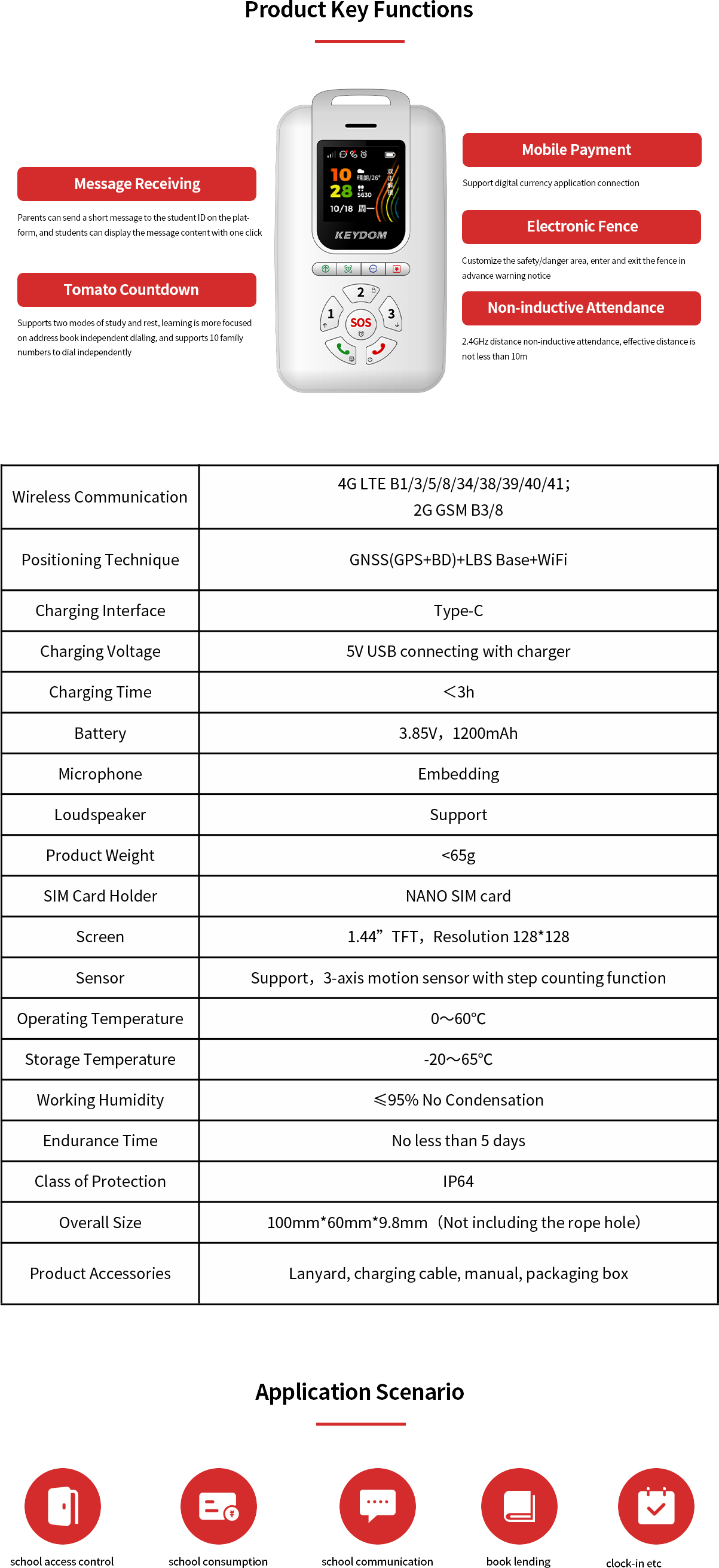 KEYDOM's Mini Kids Phone also called smart campus card, is specially tailored for K12 school students. It could achieve multi-functions such as security protection, identity authentication, thus enable students to enjoy a digital school life.