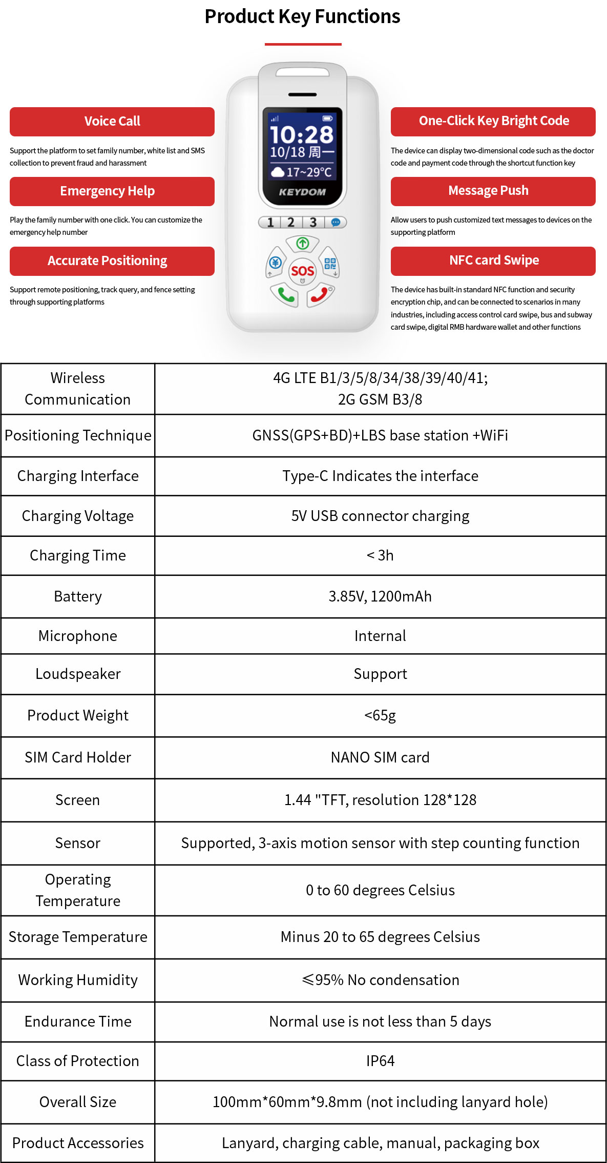 KEYDOM's Mini Seniors Phone is also called smart seniors card , it is an IoT wearable device, especially tailored for the healthcare industry. It integrates high-definition calling, mobile payment, emergency assistance, medication reminder, and other functions to provide more convenient healthcare services for the elderly. With its multiple positioning and data communication capabilities, the accompanying service platform offers security management, instant messaging, and data analysis services for elderly relatives, healthcare institutions, civil affairs departments etc., facilitating the digital transformation and upgrading of the healthcare industry.